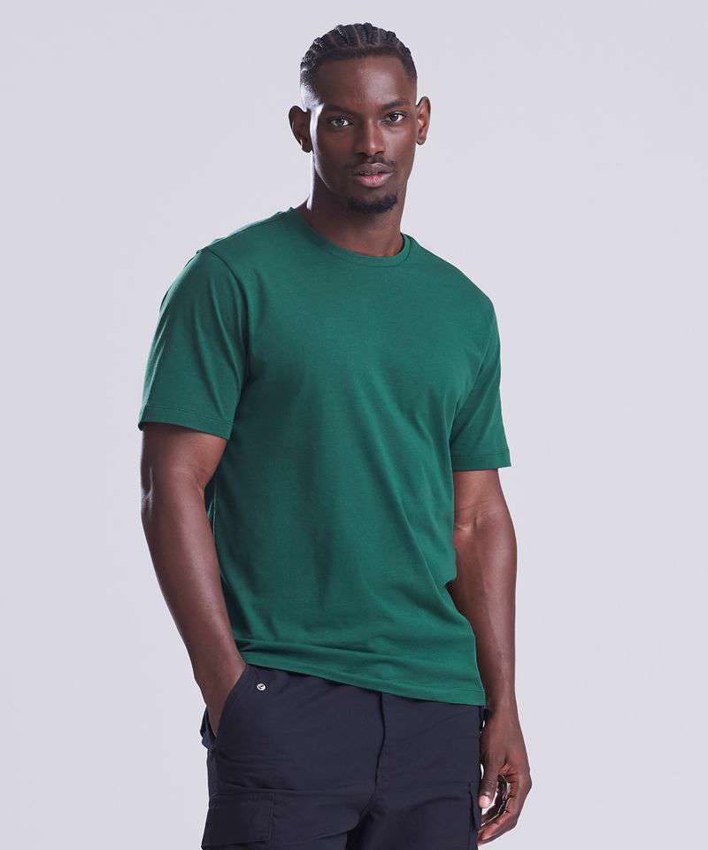 Relaxed fit T. Short sleeves. Side seams. PurePrint BC Cotton fabric. Taped back neck. Twin needle stitch details. Ribbed crew neck. Size label only for easy rebranding.